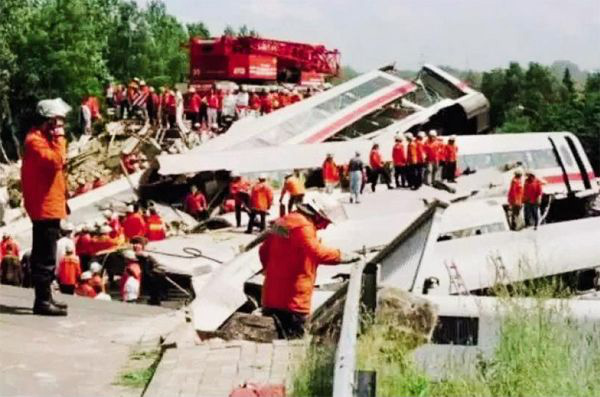 1998年,德國(guó)ICE系列的老大哥——ICE-1號(hào)列車從慕尼黑開往漢堡。到達(dá)艾雪德村附近時(shí),因?yàn)橐粋€(gè)零部件的問題,第二節(jié)車廂猛的脫離了軌道。接著,一節(jié)節(jié)車廂挨個(gè)脫軌。巧的是,鐵路上方一座橋梁橫跨而過。支撐梁被脫軌的第三節(jié)車廂撞毀,瞬間坍塌,壓到了第五節(jié)車廂上。后面的車廂,因?yàn)閼T性撞上了第五節(jié)車廂,瞬間成為一片廢墟。這輛列車?yán)铮偣?00名乘客,有101人死亡,88人重傷,106人輕傷,成為了世界上傷亡率最高的鐵路事故。事后調(diào)查發(fā)現(xiàn),ICE-1使用的車輪是雙層鋼輪,這是一種用在慢速列車上的車輪,德鐵已經(jīng)多次接到更換的建議。但是運(yùn)行7年來,從未出過問題,于是建議被忽視,那維修時(shí)總該被發(fā)現(xiàn)吧,可是德鐵工作人員檢查滾輪時(shí),竟然只用手電筒照一照,最終因?yàn)殇撊Ξa(chǎn)生金屬疲勞斷裂(金屬疲勞:指一些金屬長(zhǎng)時(shí)間承受遠(yuǎn)小于極限拉伸力的應(yīng)力,常年累月積累,最終斷裂),斜插入了列車車底;掛在列車車底的一小節(jié)鋼條,將變道時(shí)的防護(hù)軌挑起,防護(hù)軌洞穿了整個(gè)車廂,將整節(jié)車廂托起。于是有了前面講的一系列事故,造成了這次世界鐵路慘劇的發(fā)生。誰也沒有想到,這竟然發(fā)生在制造業(yè)位居世界前列的德國(guó)。但這,并不是德國(guó)高鐵最后一次發(fā)生事故,比如2017年和剛剛過去的2019年就發(fā)生兩起嚴(yán)重的脫軌事故。
